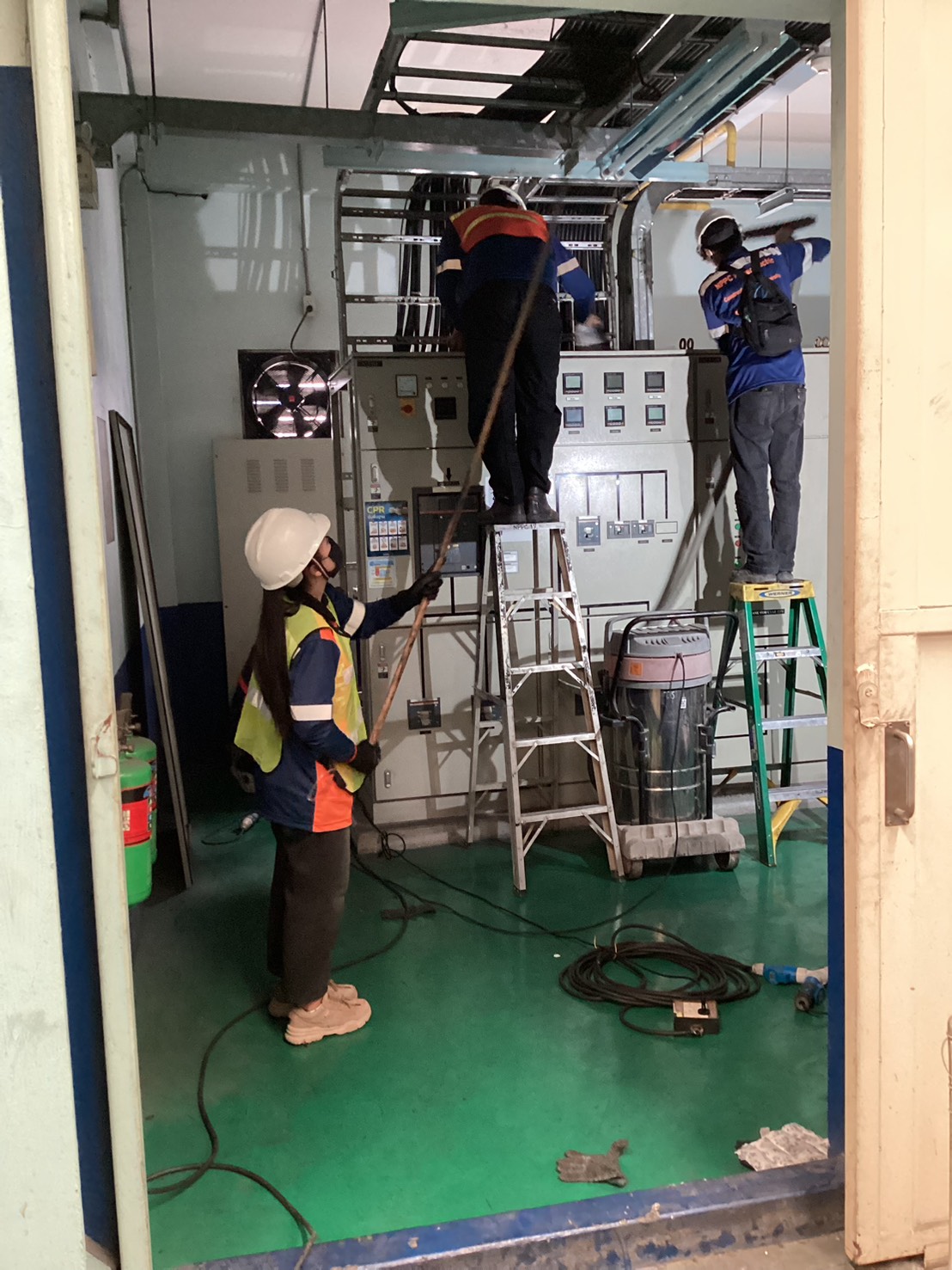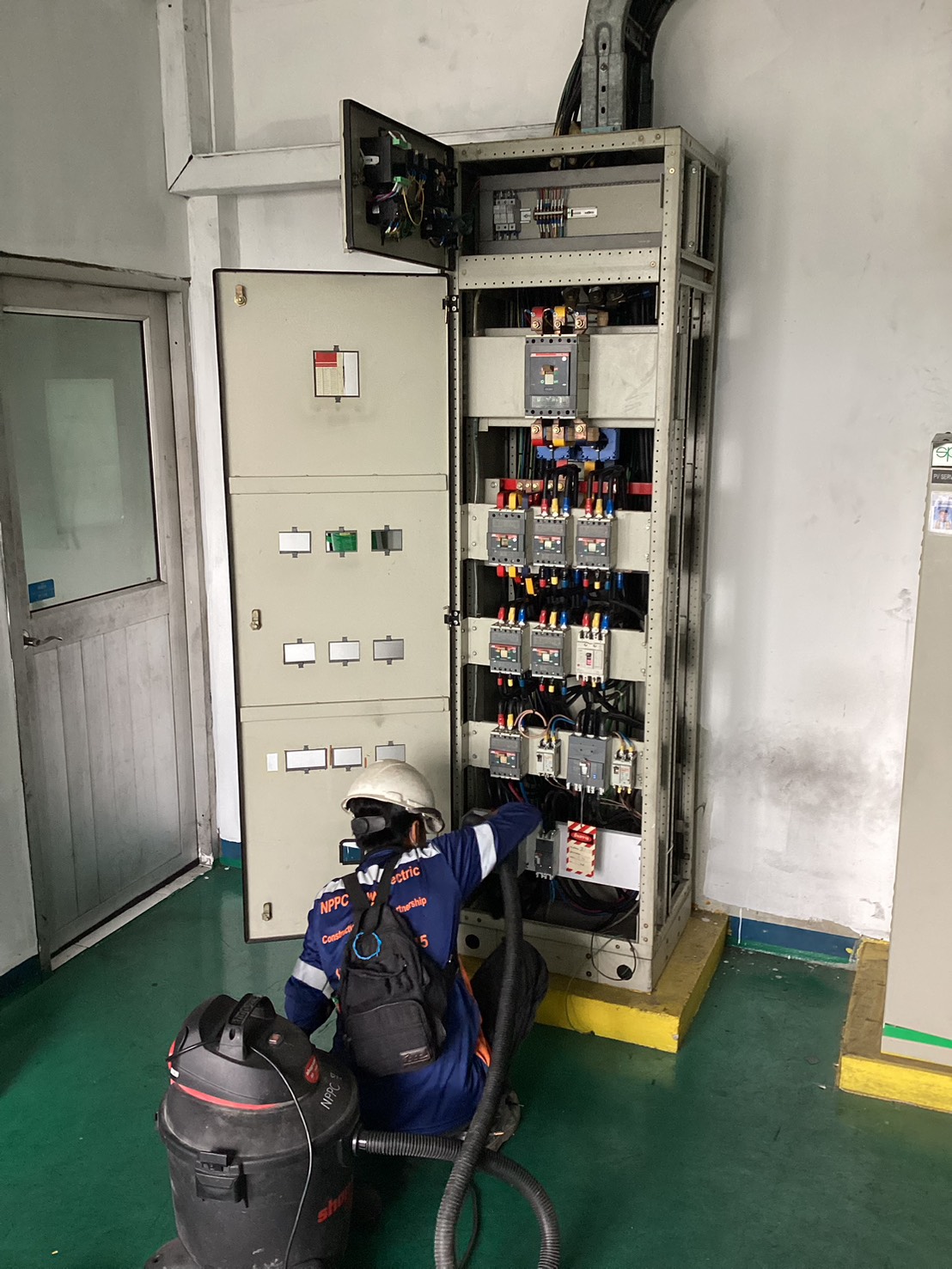 โซลูชันจากเรา: ทีมผู้เชี่ยวชาญของ NPPC ได้เข้าดำเนินการตามแผนที่วางไว้ โดยเริ่มจากการตรวจสอบสภาพหม้อแปลงไฟฟ้าภายนอก จากนั้นจึงทำการ Shutdown ระบบไฟฟ้าอย่างปลอดภัย ทีมงานได้เข้าปฏิบัติงานในห้อง MDB-ROOM POD-3 ทำการเปิดตู้ MDB-1 และ MDB-2 เพื่อใช้เครื่องดูดฝุ่นอุตสาหกรรมทำความสะอาดฝุ่นละอองที่สะสมตามสายเคเบิลและอุปกรณ์ภายในอย่างละเอียด จากนั้นจึงทำการตรวจสอบและขันแน่นจุดเชื่อมต่อบัสบาร์และสายไฟทุกจุด พร้อมทั้งทำความสะอาดแผงควบคุมและมิเตอร์ต่างๆ