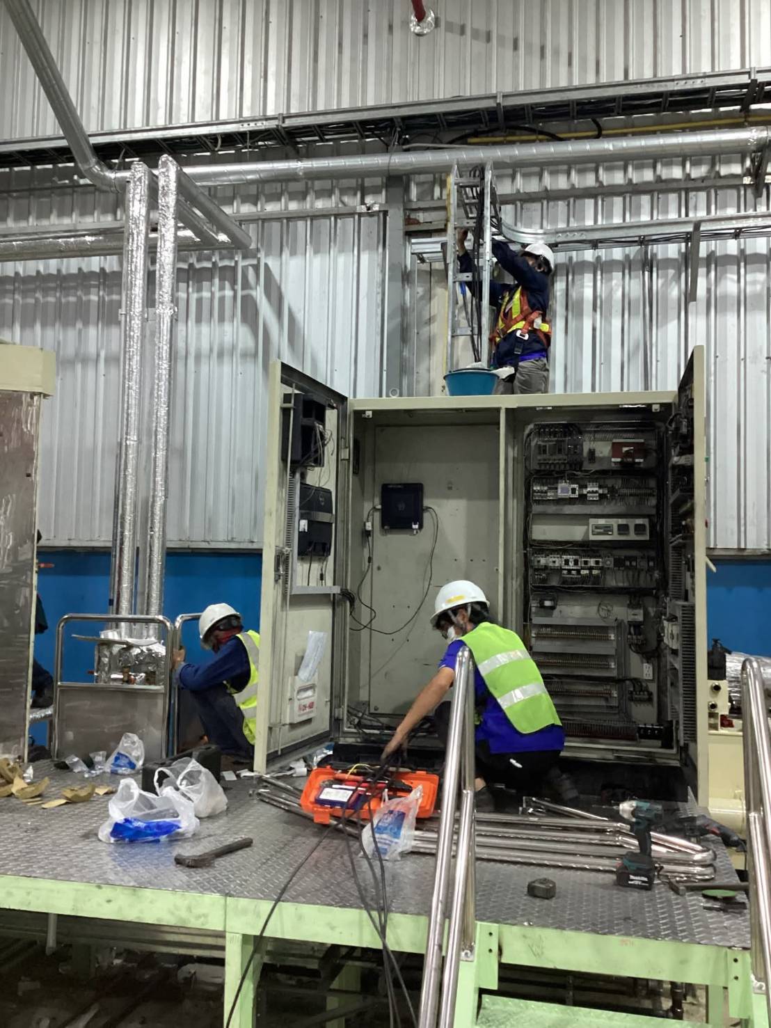 (Control System): ทีมช่างควบคุมได้เข้าทำงานกับตู้คอนโทรลหลัก ทำการเดินสายไฟภายในตู้, เชื่อมต่อ PLC, และไล่สายไฟควบคุม (Control Wires) ที่มีจำนวนมากอย่างละเอียดและแม่นยำ