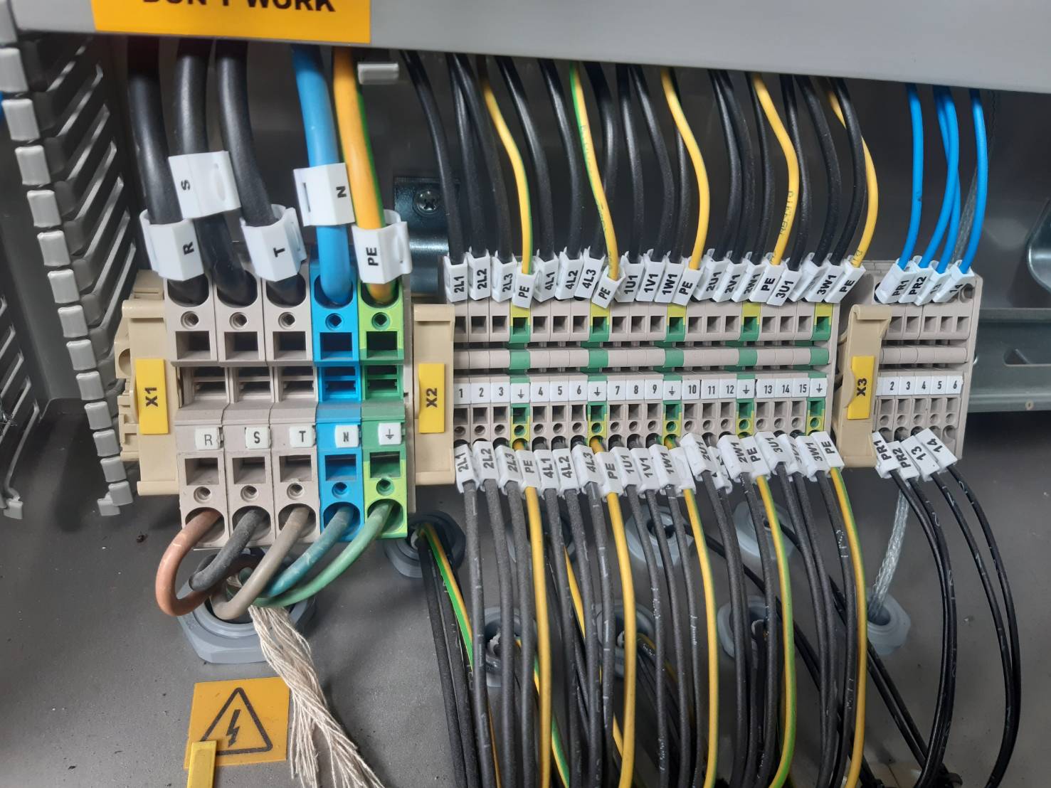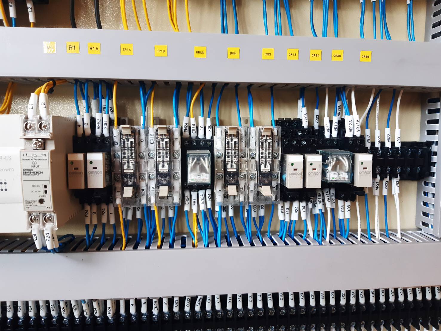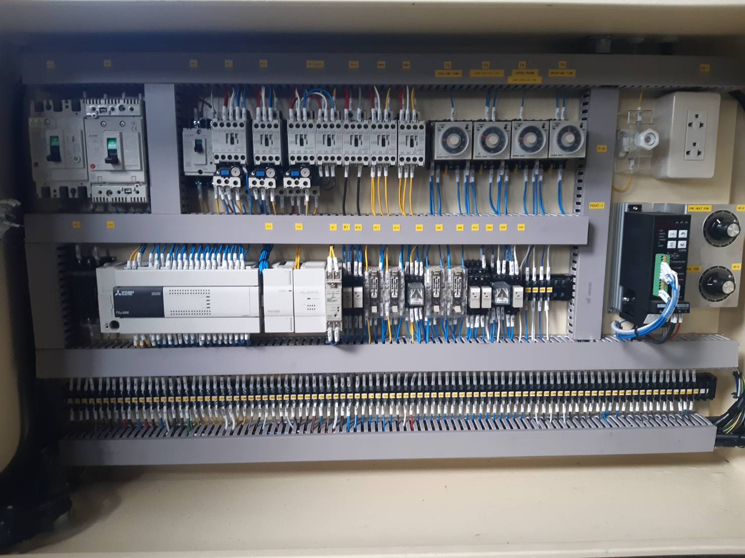 งานวายริ่งตู้คอนโทรลมาตรฐานสูง (Professional Wiring): เราเข้าสายไฟในตู้ควบคุมอย่างประณีต มีการใส่ Wire Marker (เบอร์สาย) และจัดเก็บสายลงรางอย่างเป็นระเบียบ (ดังภาพ) เพื่อความสวยงามและง่ายต่อการไล่วงจร