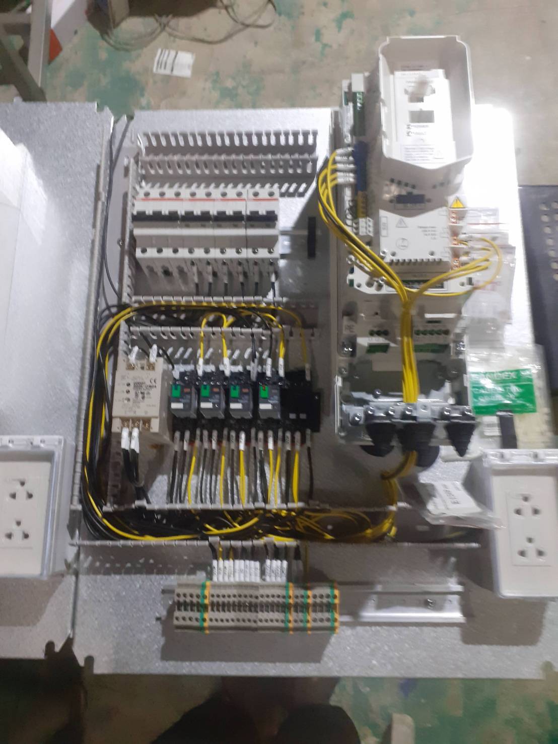 เชื่อมต่อมอเตอร์และระบบขับเคลื่อน: เดินสายไฟกำลังเข้าสู่มอเตอร์, เกียร์, และ Inverter เพื่อควบคุมความเร็วและทิศทางการหมุนของสายพานลำเลียงและกลไกต่างๆ